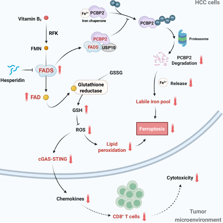 本研究发现维生素B2(VB2)代谢在肝细胞癌(HCC)中显著上调,其中唯一在肝癌中普遍高表达的关键酶 FADS 通过促进肿瘤细胞生长、增强铁死亡抗性并抑制 CD8⁺ T 细胞浸润,从而推动 HCC 进展并削弱抗 PD-1 免疫治疗效果。FADS 通过其酶促产物 FAD 以及非酶促稳定 PCBP2 的方式介导抗铁死亡,并通过干扰 cGAS-STING 通路降低 CD8 T 细胞募集。敲低 FADS 可诱导肿瘤细胞死亡并增强抗肿瘤免疫,而临床可用的 FADS 抑制剂橙皮苷在小鼠模型中表现出抗肿瘤活性。因此,研究强调 VB2 代谢在 HCC 中的重要作用,并证明靶向 FADS 具有潜在治疗价值。